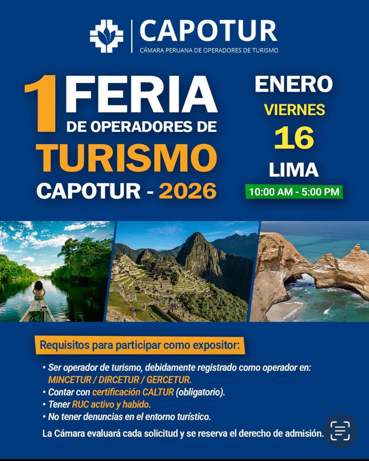 Enero de 2026 iniciará con uno de los eventos de turismo con gran proyección en el sector. Y es que la Cámara Peruana de Operadores de Turismo (Capotur) anunció la organización de su primera feria nacional de turismo.