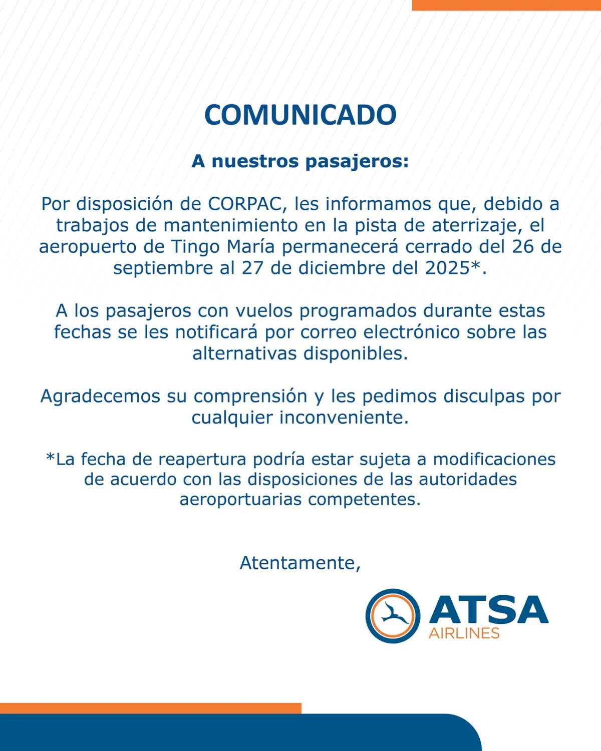 La información ya ha sido comunicada a los pasajeros de ATSA Airlines mediante correo electrónico. La empresa señaló que está trabajando en ofrecer alternativas para quienes ya habían adquirido boletos hacia o desde Tingo María.