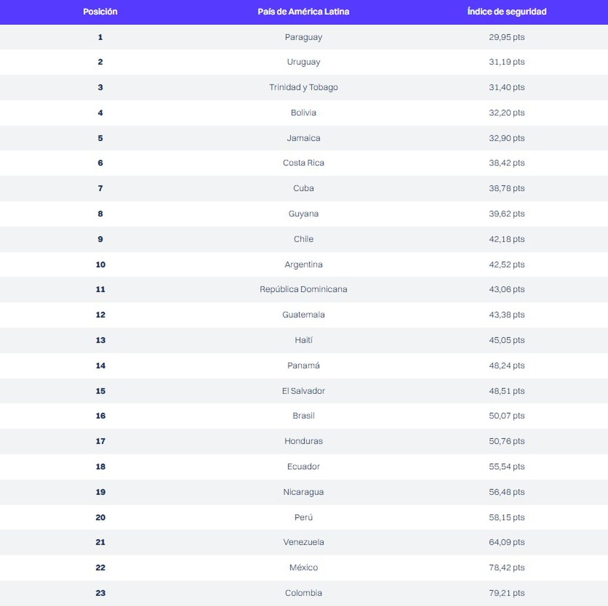 Los países de América Latina experimentan situaciones de seguridad muy contrastadas, según evidencia el ranking de HelloSafe. Así, Paraguay, Uruguay, Trinidad y Tobago y Bolivia gozan de un índice de seguridad bastante elevado para los viajeros. Por el contrario, Colombia, México y Venezuela figuran entre los países latinoamericanos más peligrosos, al igual que Perú, donde la inseguridad se ha vuelto uno de los principales escollos para la reactivación total del turismo.
