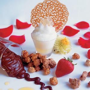 • Cheesecake marmolado, tuil de almendras y salsa de frutos rojos: "Es una base de cheesecake tradicional que se unifica con una preparación de chocolate junto con una salsa de frutos rojos en almíbar".