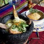 • Molcajete con salsa verde: "Deliciosa variedad de sabores mexicanos, con tiras de carnes de res y cerdo, cebollitas cambray y queso, sobre salsa verde de tomatillo. Sale con rebanadas de papas regias".