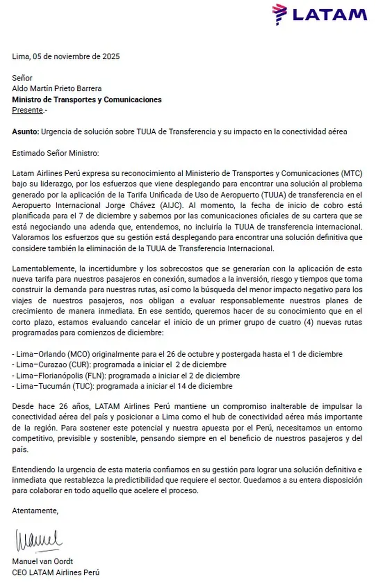 A través de una carta dirigida al ministro Aldo Martín Prieto Barrera, Latam anunció que evalúa suspender cuatro rutas internacionales programadas para diciembre. La medida estaría vinculada a los posibles sobrecostos que generaría la implementación de la nueva TUUA, cuya entrada en vigencia está prevista para el 7 de diciembre de 2025 en el Aeropuerto Internacional Jorge Chávez.